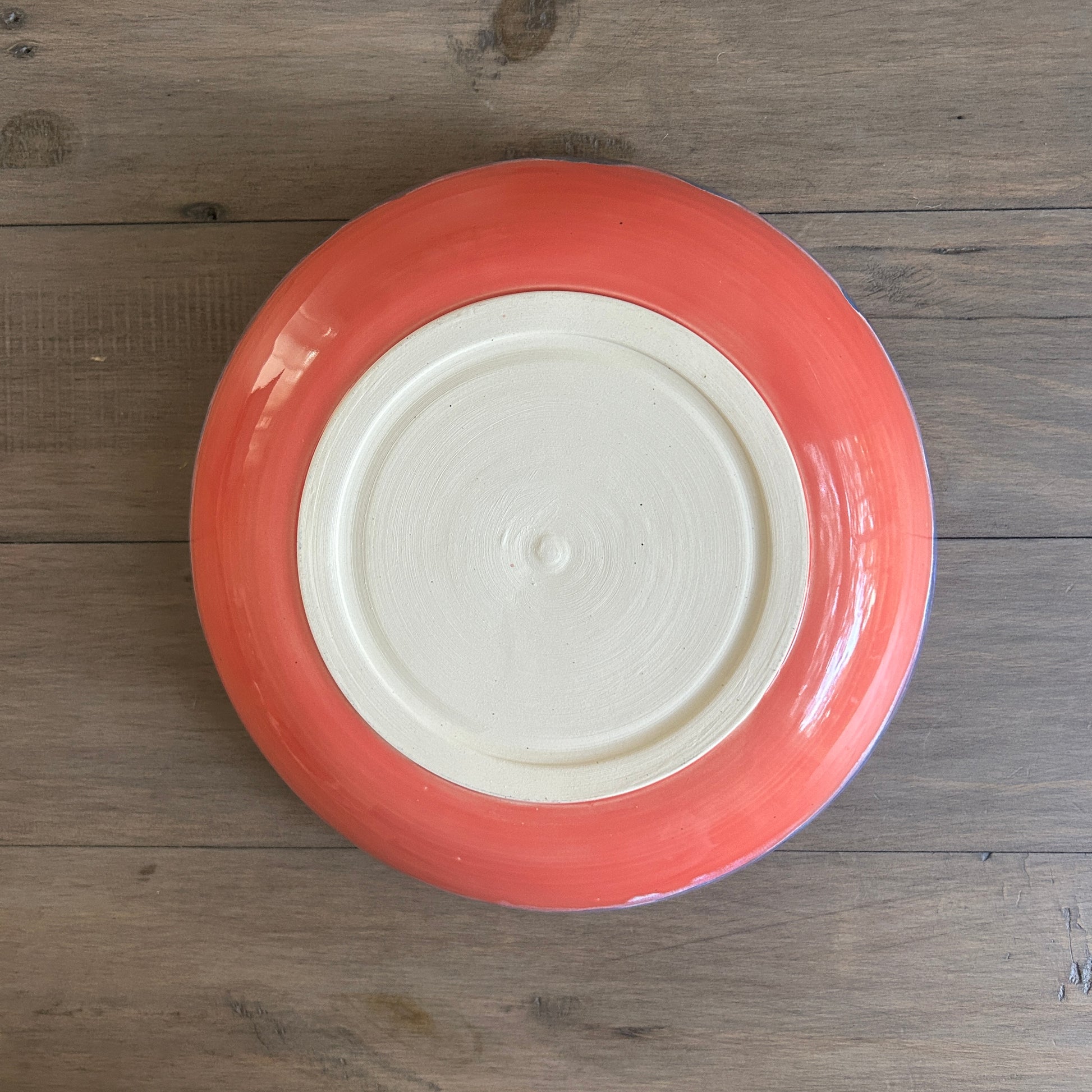 This charming bowl measures 10.5" across and stands 2.5" tall. Lovingly crafted on the potter's wheel, it features a vibrant coral red base with a fun blue and white drip rim on the outside. Inside, you’ll find a silky smooth, creamy eggshell glaze. A playful and versatile piece that’s sure to brighten up any kitchen!
