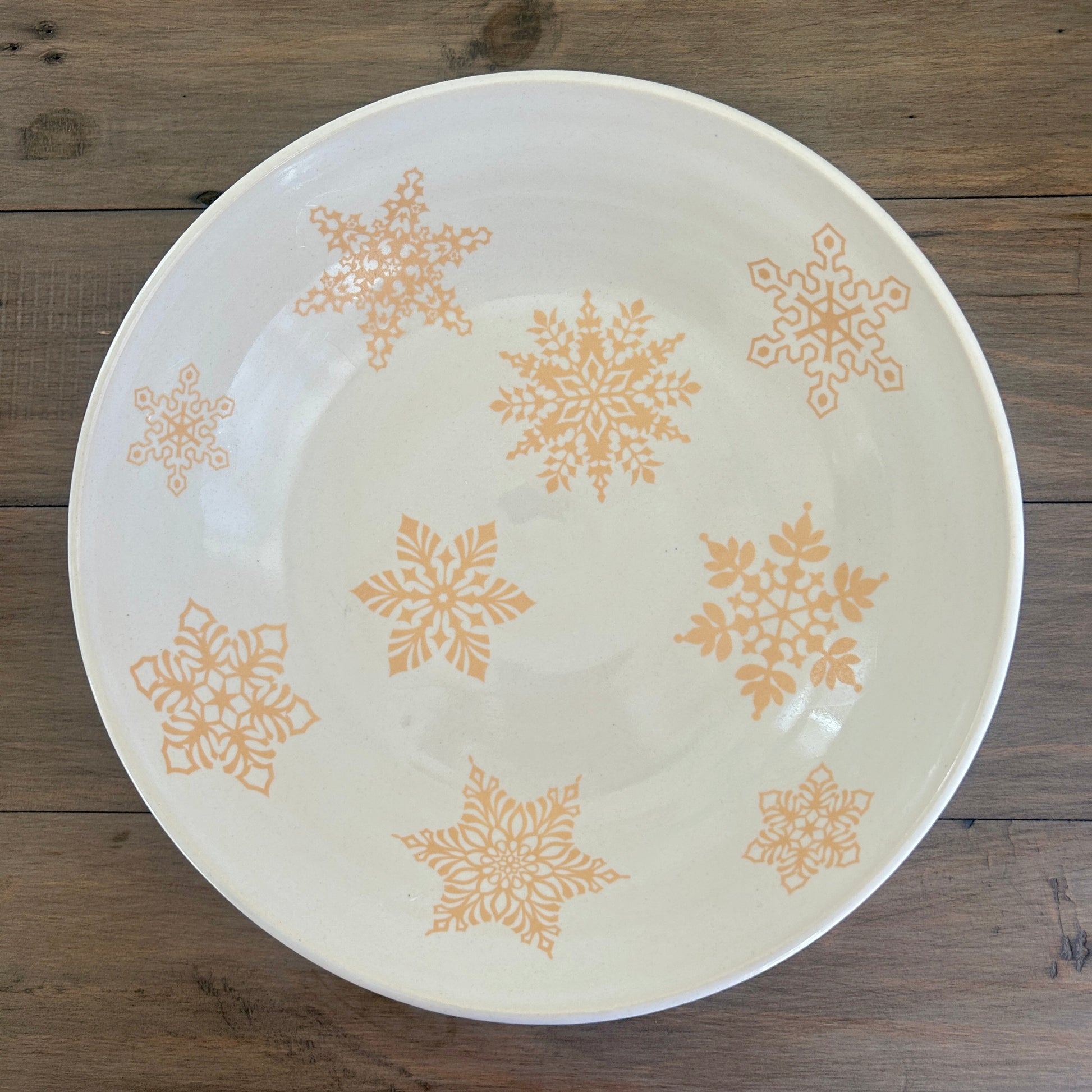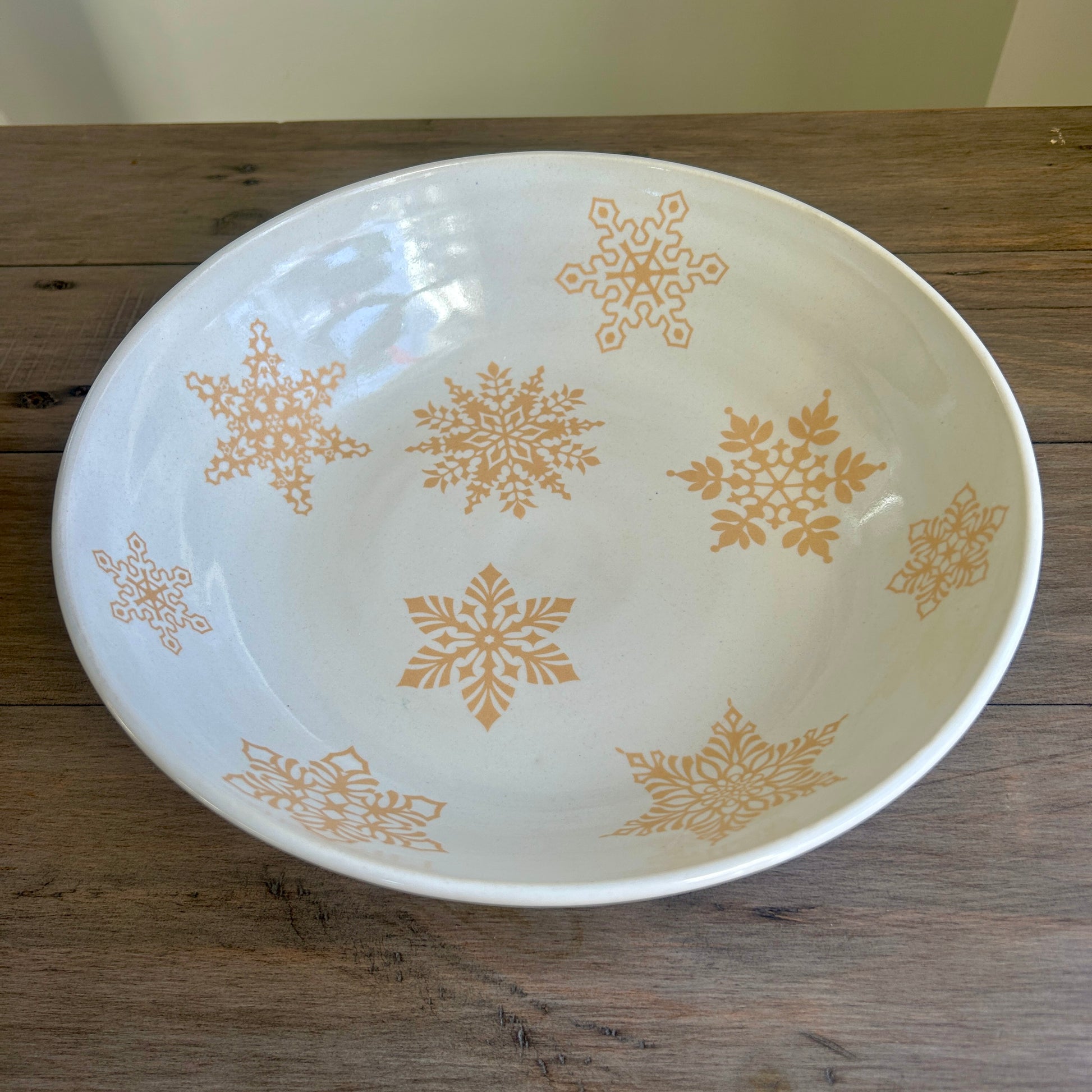 Bring festive flair to your table with this charming serving bowl, featuring a soft eggshell glaze adorned with shimmering gold snowflakes. Measuring 10.5" across and 4" tall, it offers plenty of space for generous portions of salads, sides, or seasonal dishes.