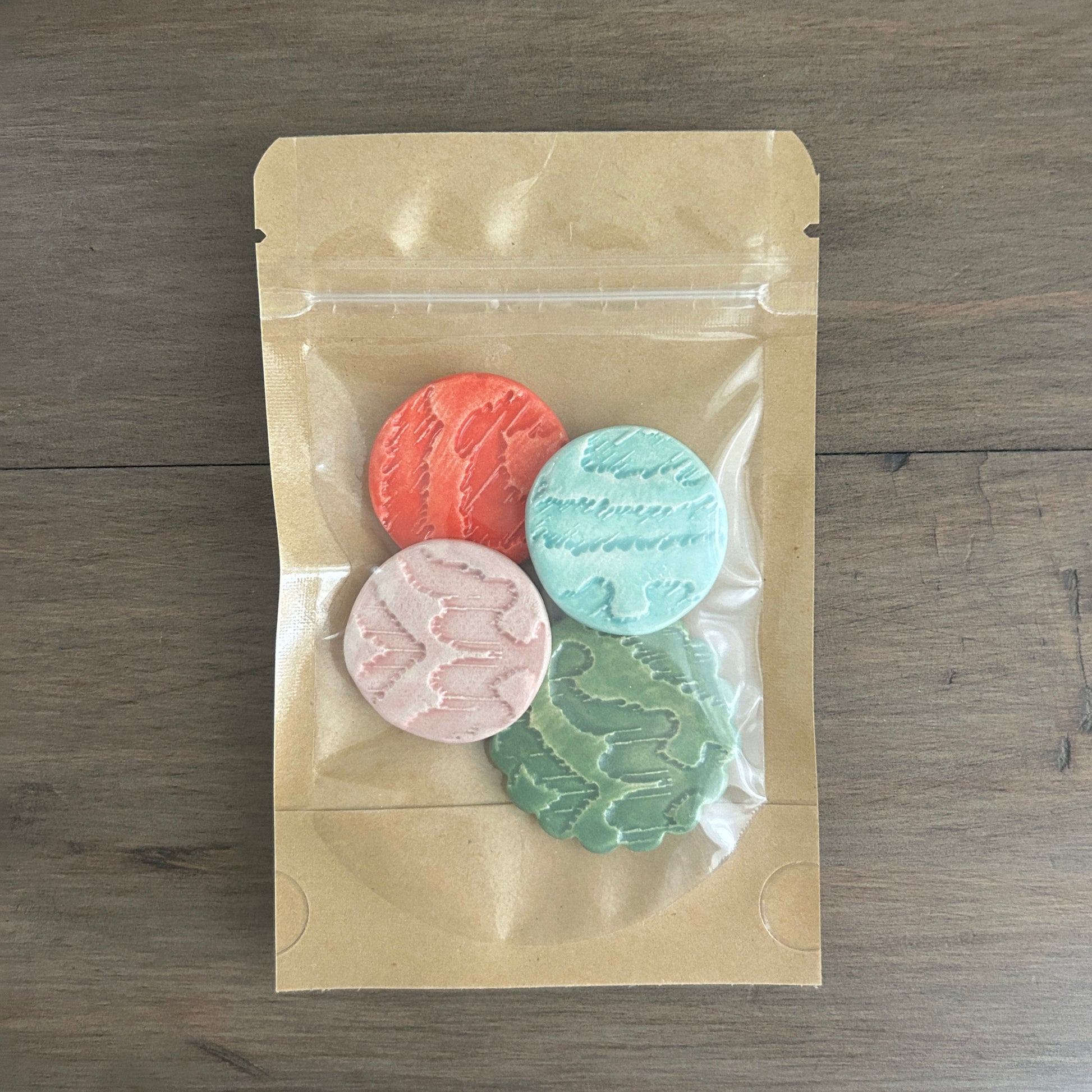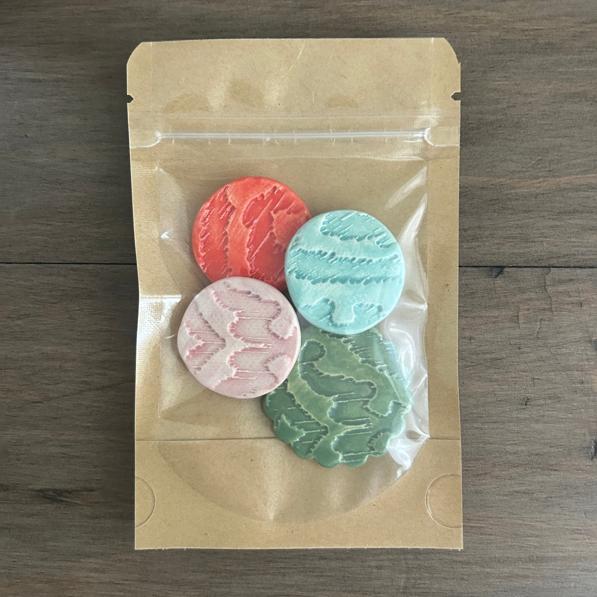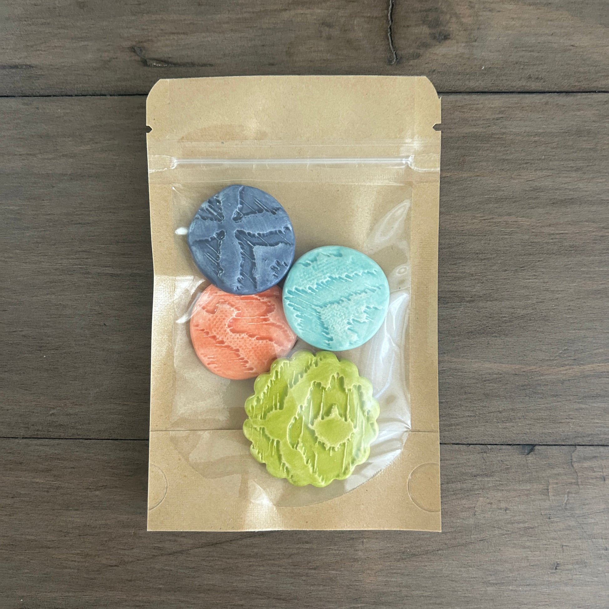 Sets of 4 hand-made magnets. each one embossed, cut and glazed to bring a playful pop of color to any spot in your world.