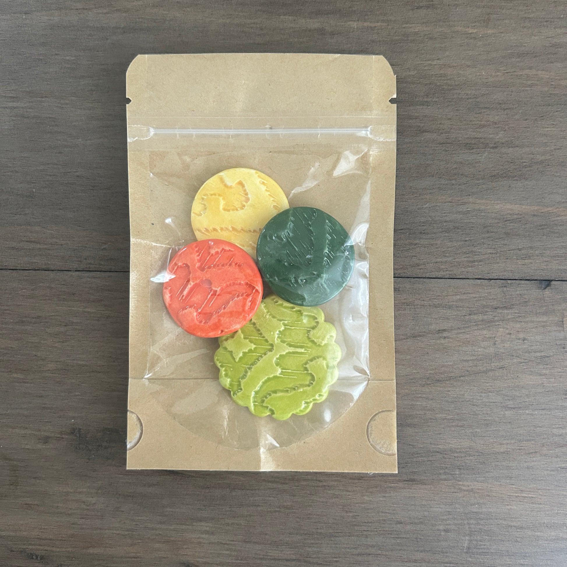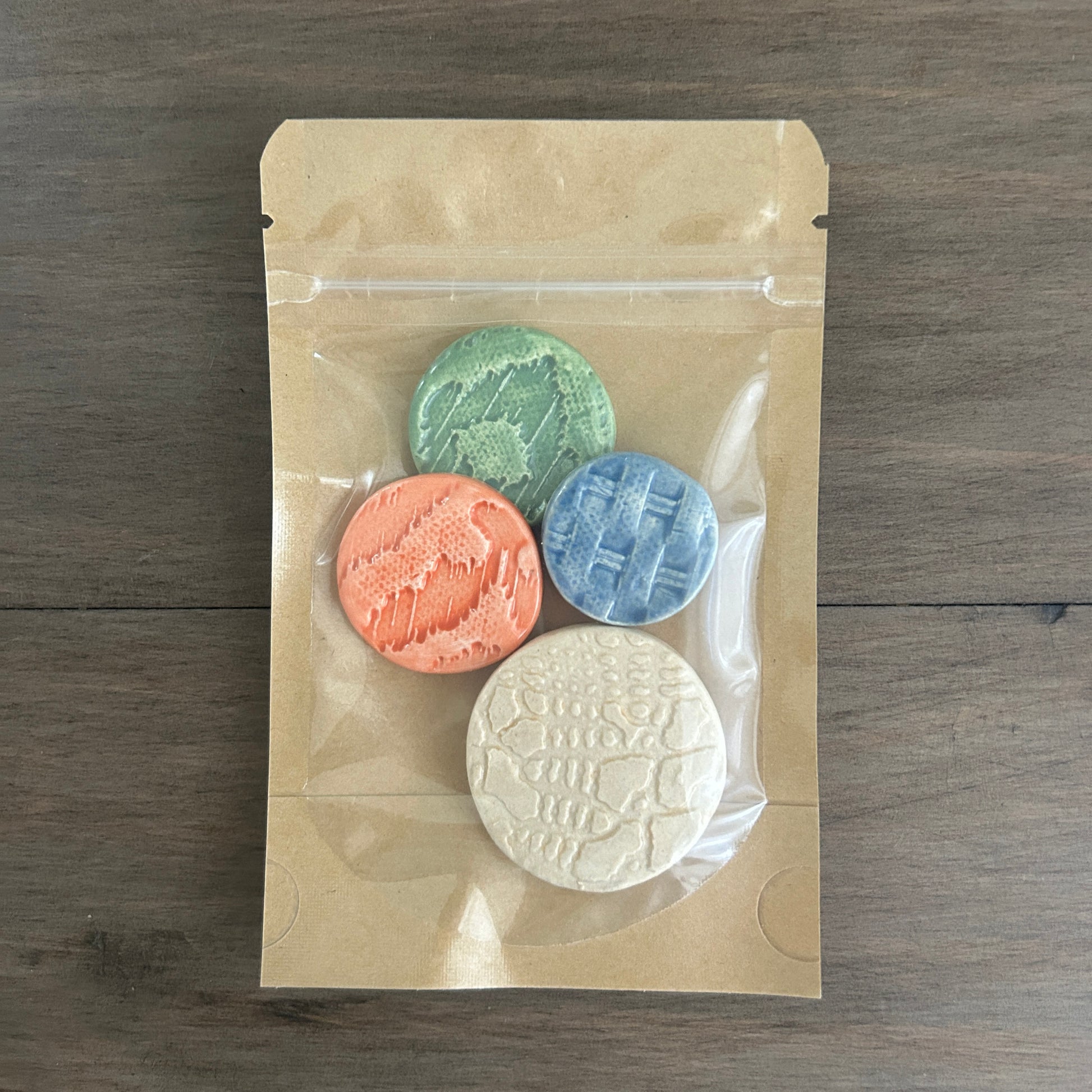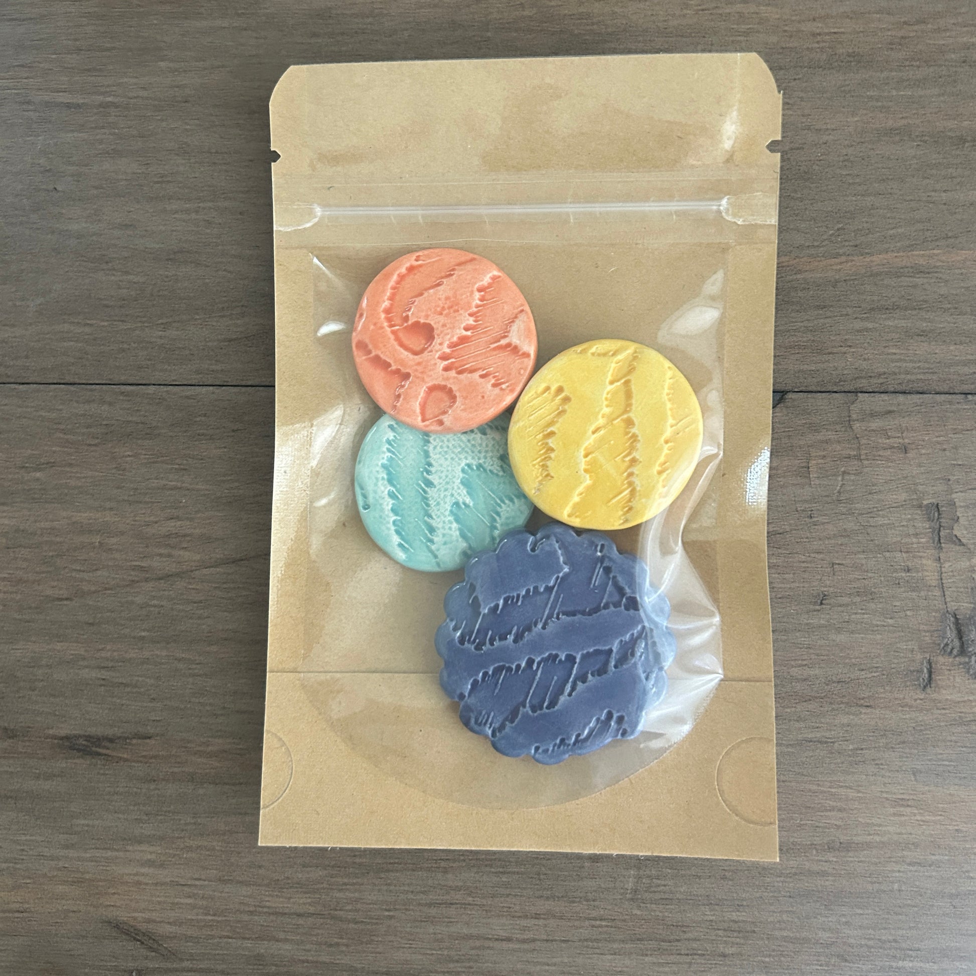 Sets of 4 hand-made magnets. each one embossed, cut and glazed to bring a playful pop of color to any spot in your world.