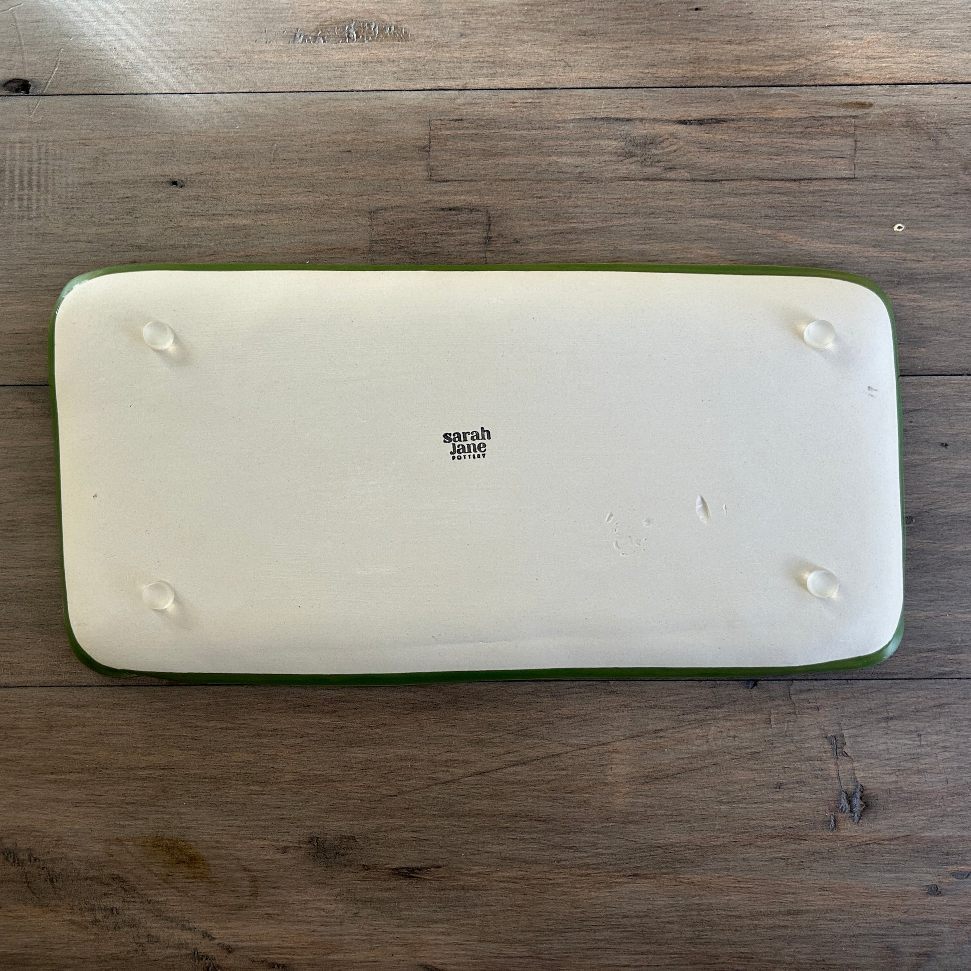 This medium rectangular tray features an leaves and berries embossed design. It’s glazed in an ivy green glaze. Measuring 12" long by 6" wide and just half an inch deep. A great addition to your serving ware.