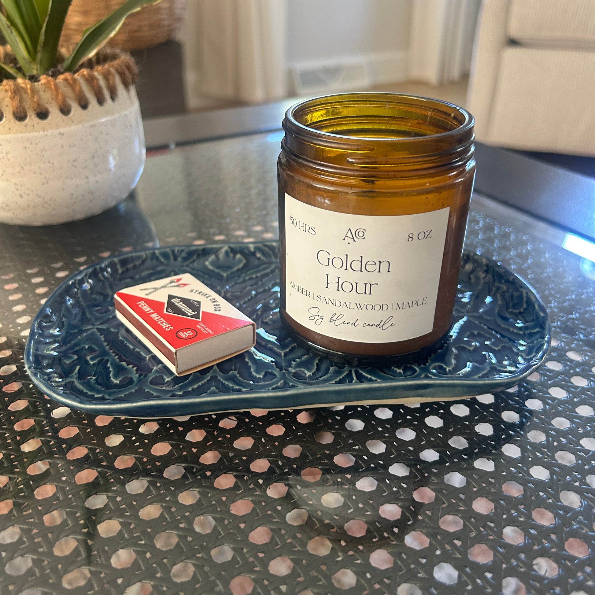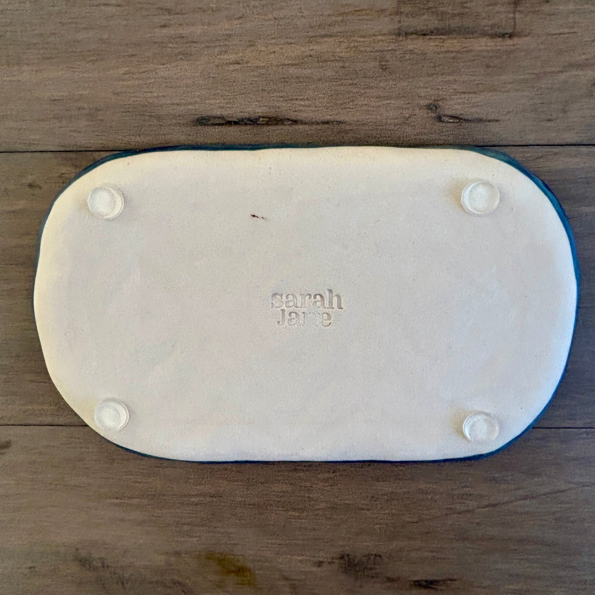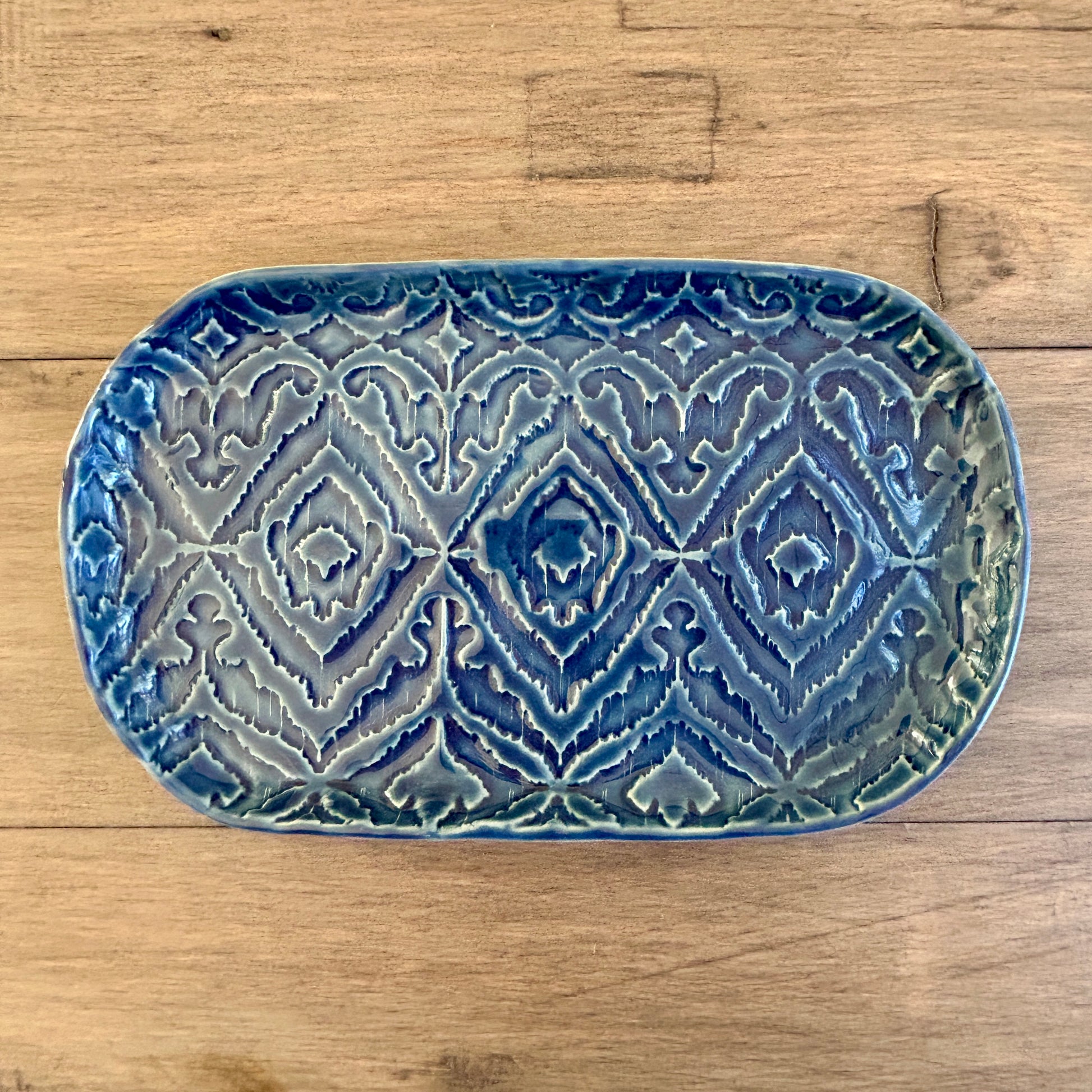 This petite oblong tray showcases a vibrant boho ikat pattern, coated in a rich royal blue celadon glaze. At 8.25" long, 5" wide, and only half an inch deep, it’s just right for resting soap by the sink, cradling a candle, or tidying up little bedside or desk treasures with style and flair.